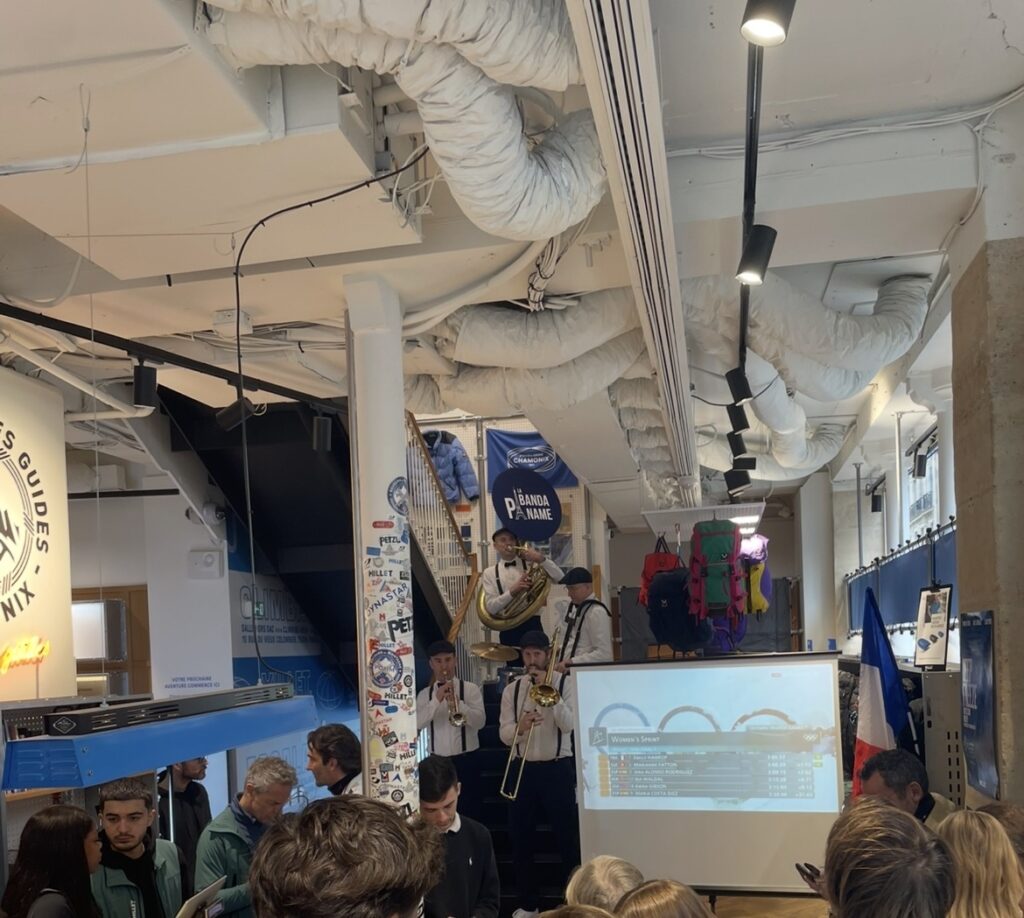Il est un peu plus de 12h30 lorsque la fanfare « La Bande à Paname » joue ses premières notes dans la boutique Millet du 6e arrondissement. Tambours, trompettes et le refrain d’une chanson repris en boucle : « Dans les yeux d’Émilie », clin d’œil au prénom de la sextuple championne du monde et favorite pour l’or. En quelques minutes, l’ambiance monte. Le magasin devient une véritable fan zone improvisée en plein Paris.